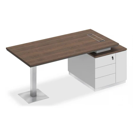 Стол состоит из столешницы, заглушки кабель-канала, металлической опоры и опорной тумбы.