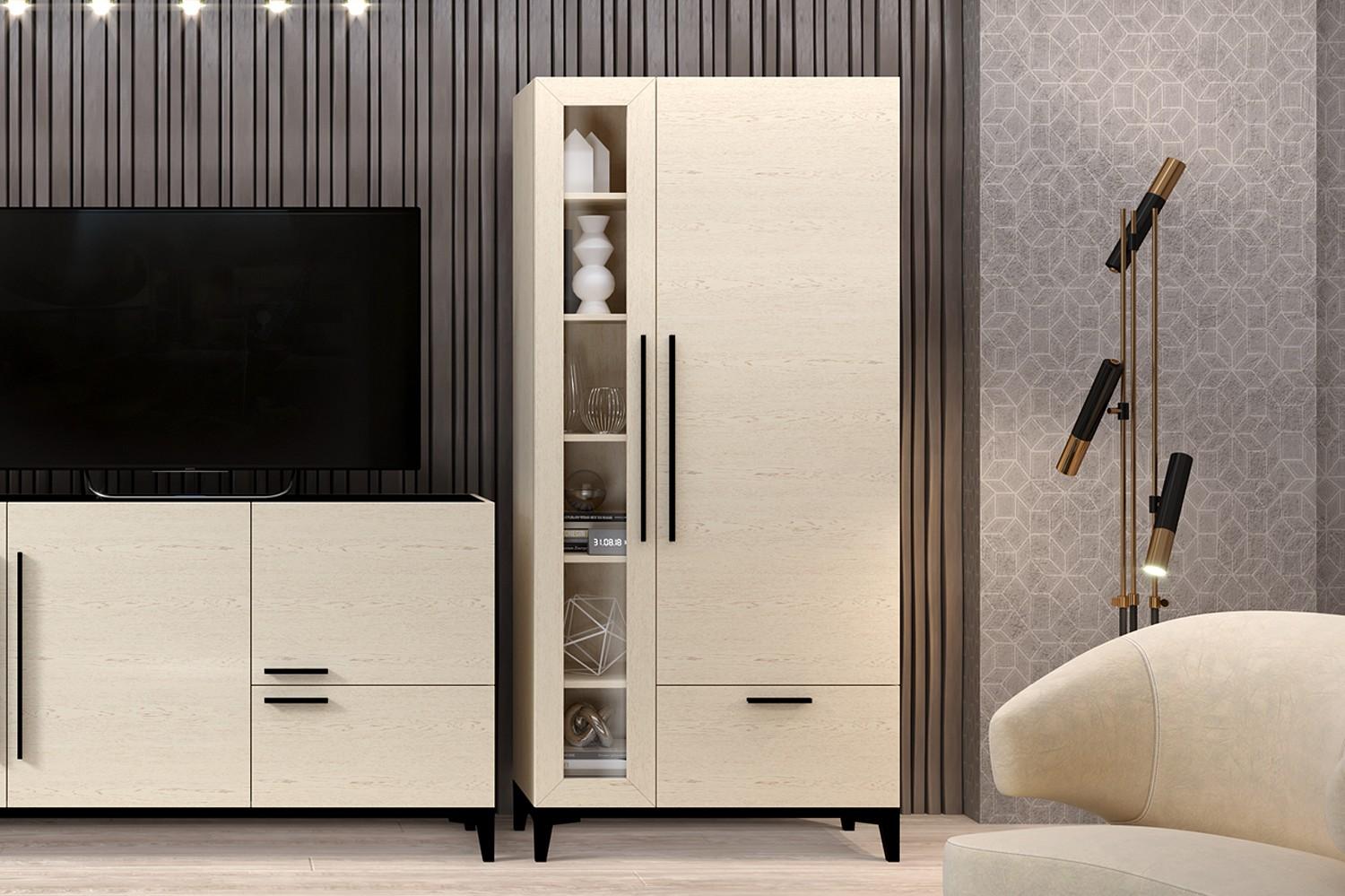 Шкаф-витрина имеет универсальную присадку для сборки на правую или левую стороны. Петли дверей оснащены доводчиком. Ящик выдвигается при помощи надежных направляющих скрытого типа. Благодаря высококачественным материалам и фурнитуре мебель послужит очень долго.