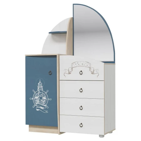 Комод Бриз с зеркалом дополнит интерьер детской или молодежной комнаты. Конструкция с закрытой секцией с дверкой и четырьмя выдвижными ящиками для хранения.