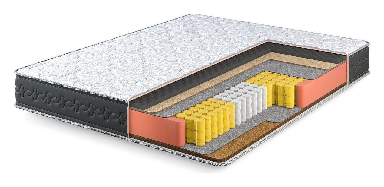 С обеих сторон матраса в качестве комфортного слоя используется 2 см искусственного латекса, этот матераил очень долговечный и упругий, благодаря этому слою на этом матрасе будет одинаково комфортно людям разных весовых категорий. Для распределения нагрузки и придания необходимой жесткости используется латексированный кокосовый лист, который кладется под латекс. В основе матраса лежит блок независимых пружин, благодаря которому матрас будет индивидуально подстраиваться под каждого спящиего и оказывать обратное давление только там, где это действительно необходимо. Чехол матраса сделан из плотного мягкого трикотажа, который стегается на 15 мм пене и синтепоне, что добавляет не много мягкости.