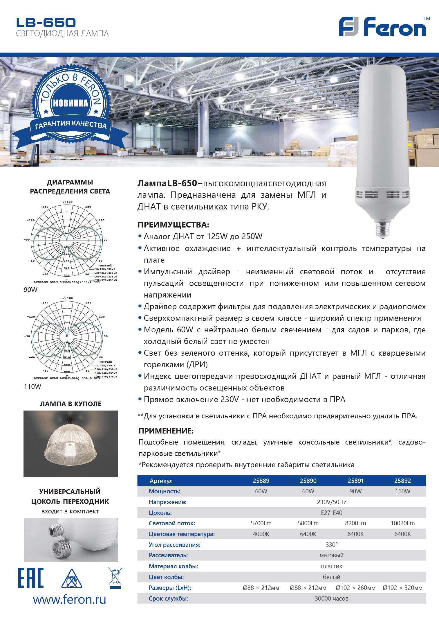 Лампа светодиодная FERON LB-650, T90 (промышленная), 60W 230V E27-E40 4000К (белый), рассеиватель матовый белый, 5700Lm, угол рассеивания 330°, 212*88мм