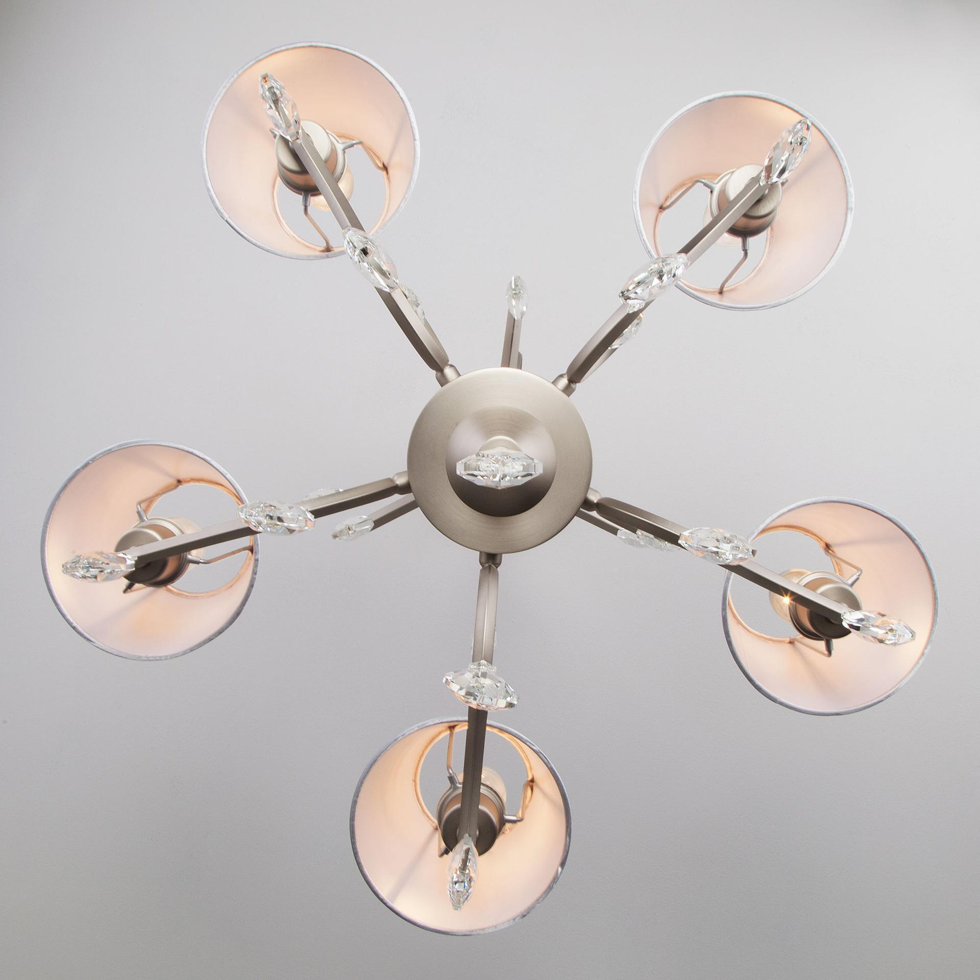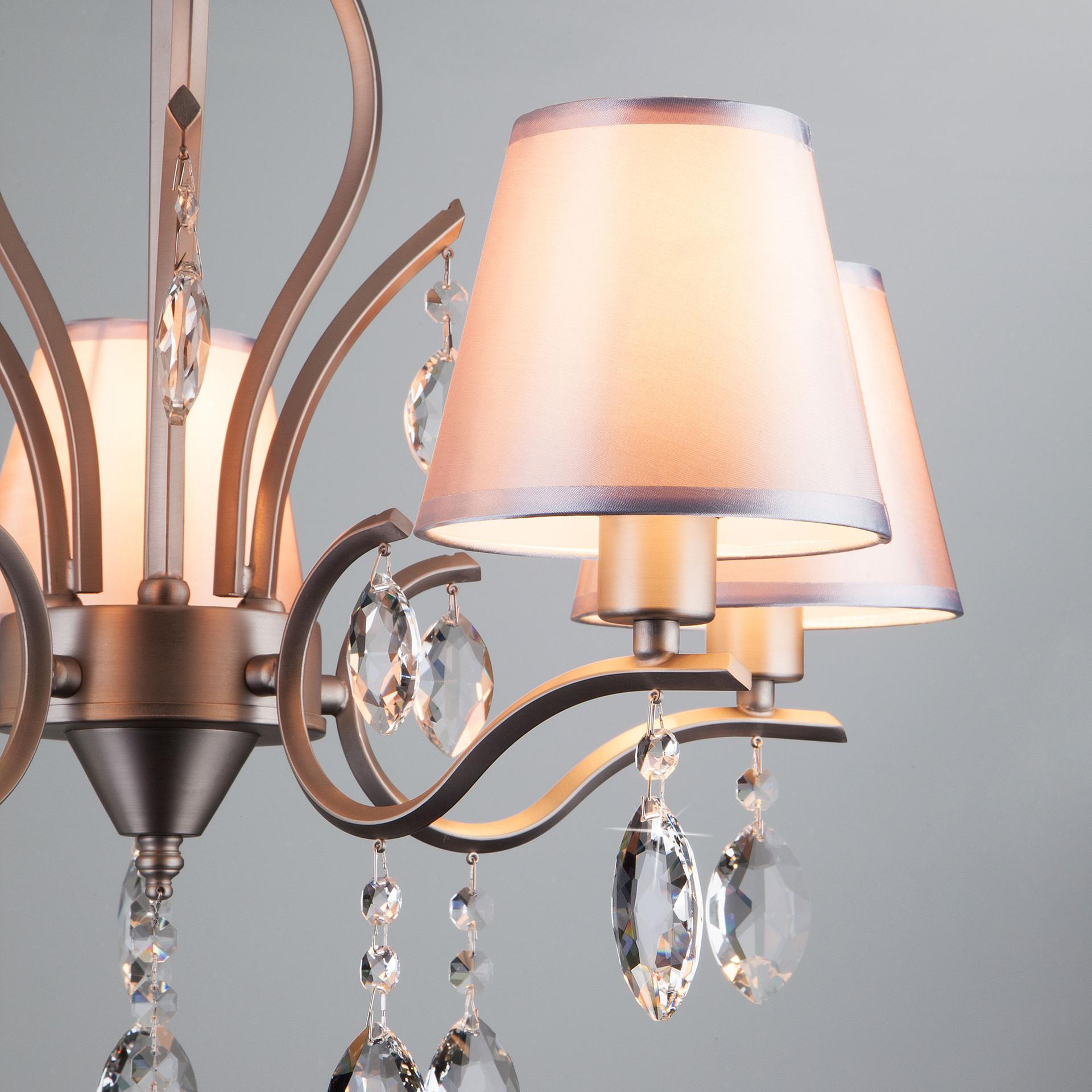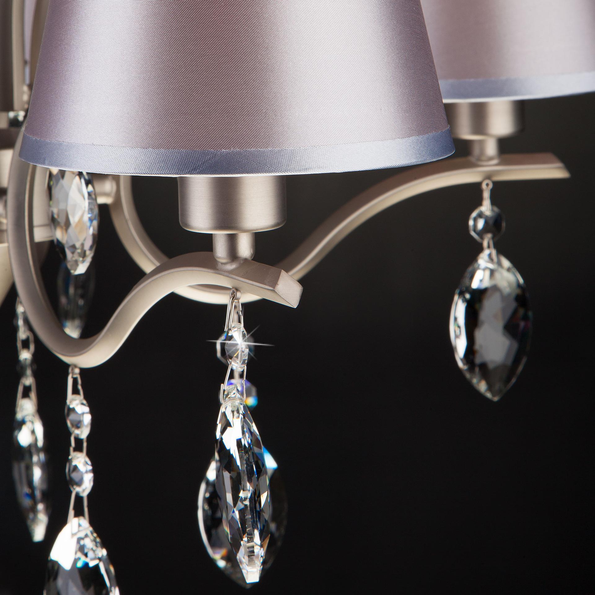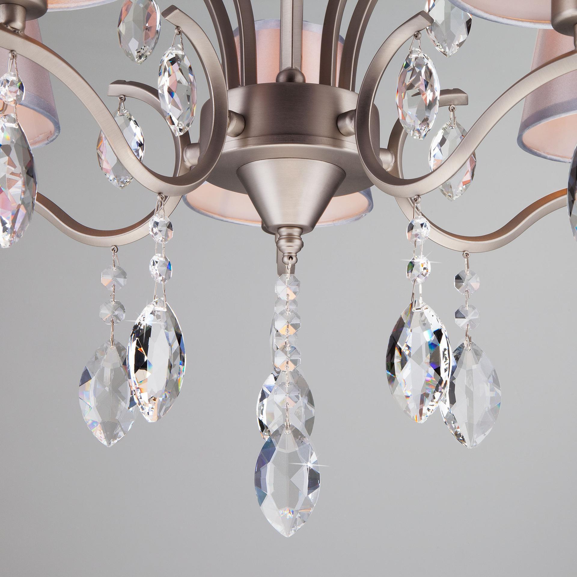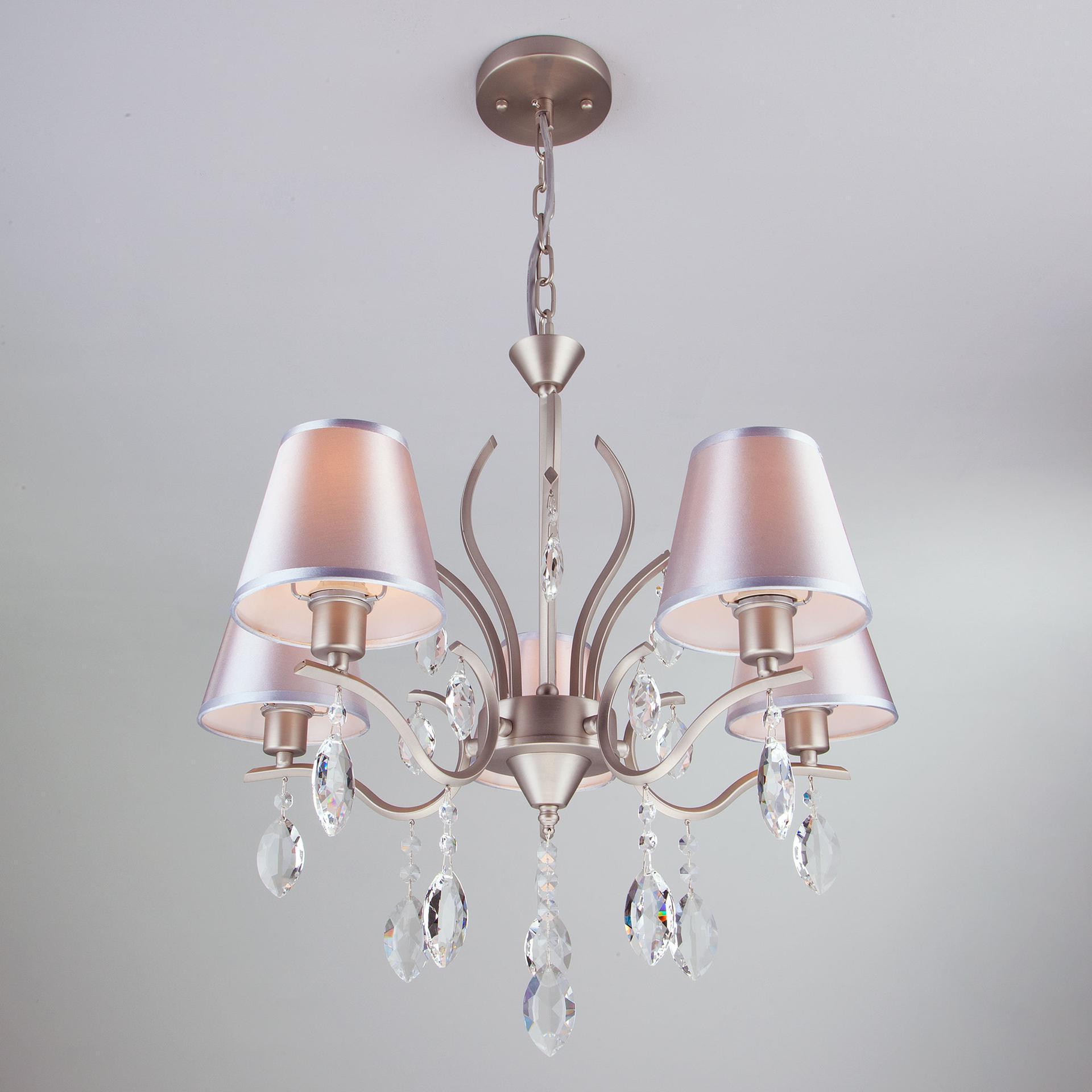 Подвесная люстра с хрусталем 10089/5 сатин-никель/прозрачный хрусталь Strotskis предназначена для создания основного освещения в современных и классических интерьерах, подходит для различных типов помещений: гостиная, спальня и рассчитана на площадь освещения 16м². Роскошная люстра оснащена патронами с цоколем Е14, которые рассчитаны на максимальную мощность ламп 40 Вт. Люстра украшена эффектным декором из хрусталя и дополнена выразительными тканевыми абажурами. Арматура изготовлена из высококачественного металла с надежным защитным покрытием. Дизайн серии «Aurelia» продуман до мелочей: серебряные абажуры идеально сочетаются с основанием цвета сатин-никель, а хрустальные подвески делают образ целостным и гармоничным. В нашем интернет-магазине вы можете купить подвесную люстру по выгодной цене.