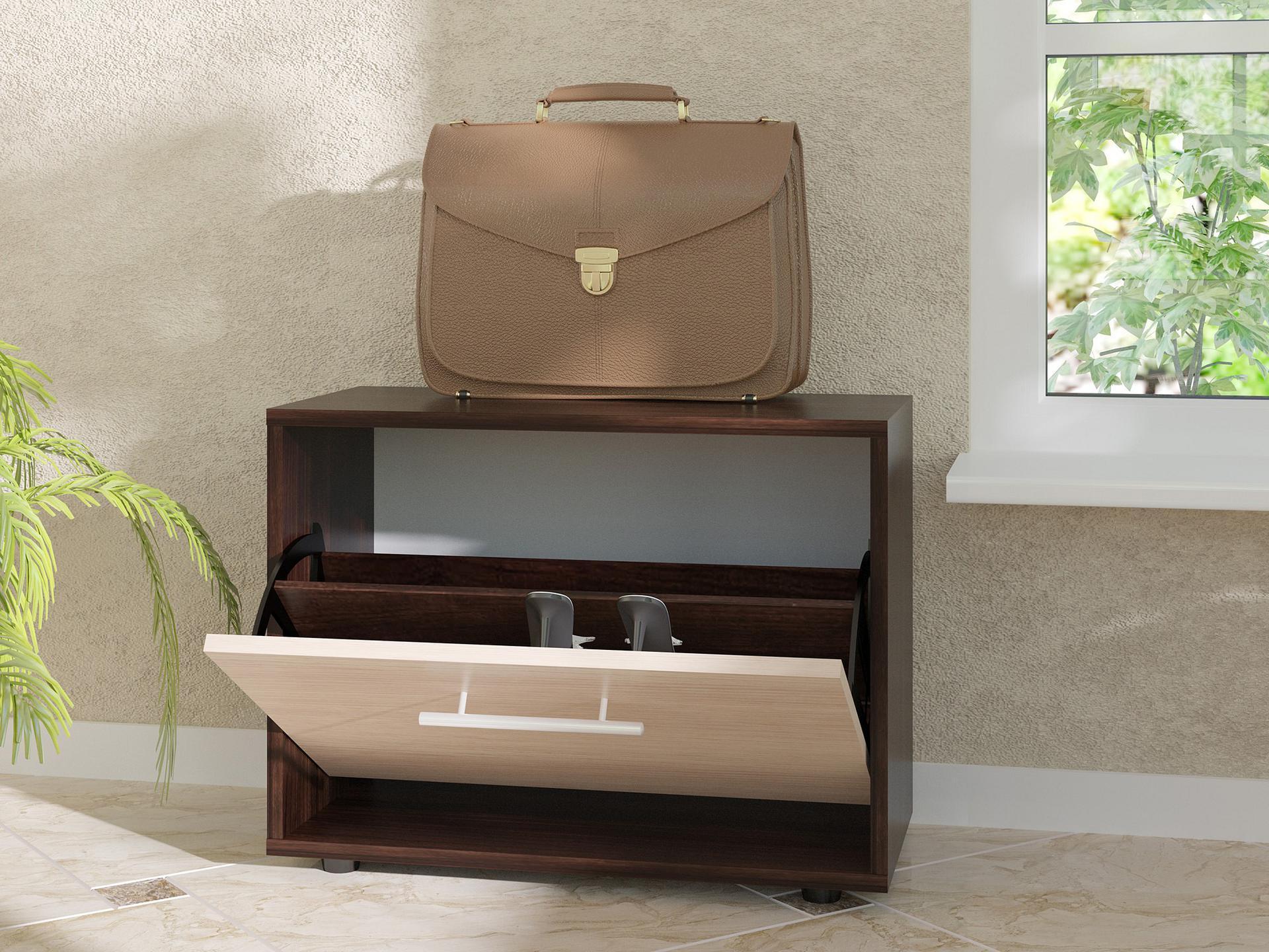 Дверца тумбы для обуви оснащена откидывающимся механизмом со специальными полками для размещения обуви, который обеспечивает удобство хранения и легкий доступ к необходимой паре кроссовок или туфель.